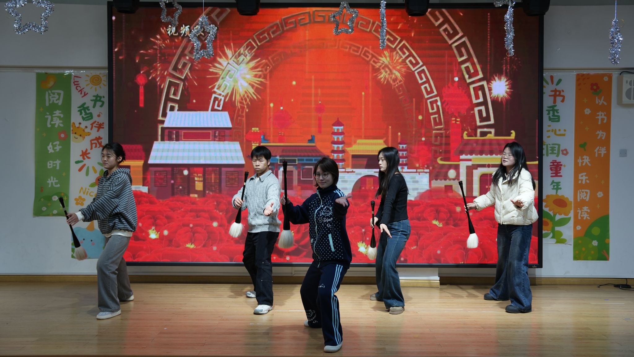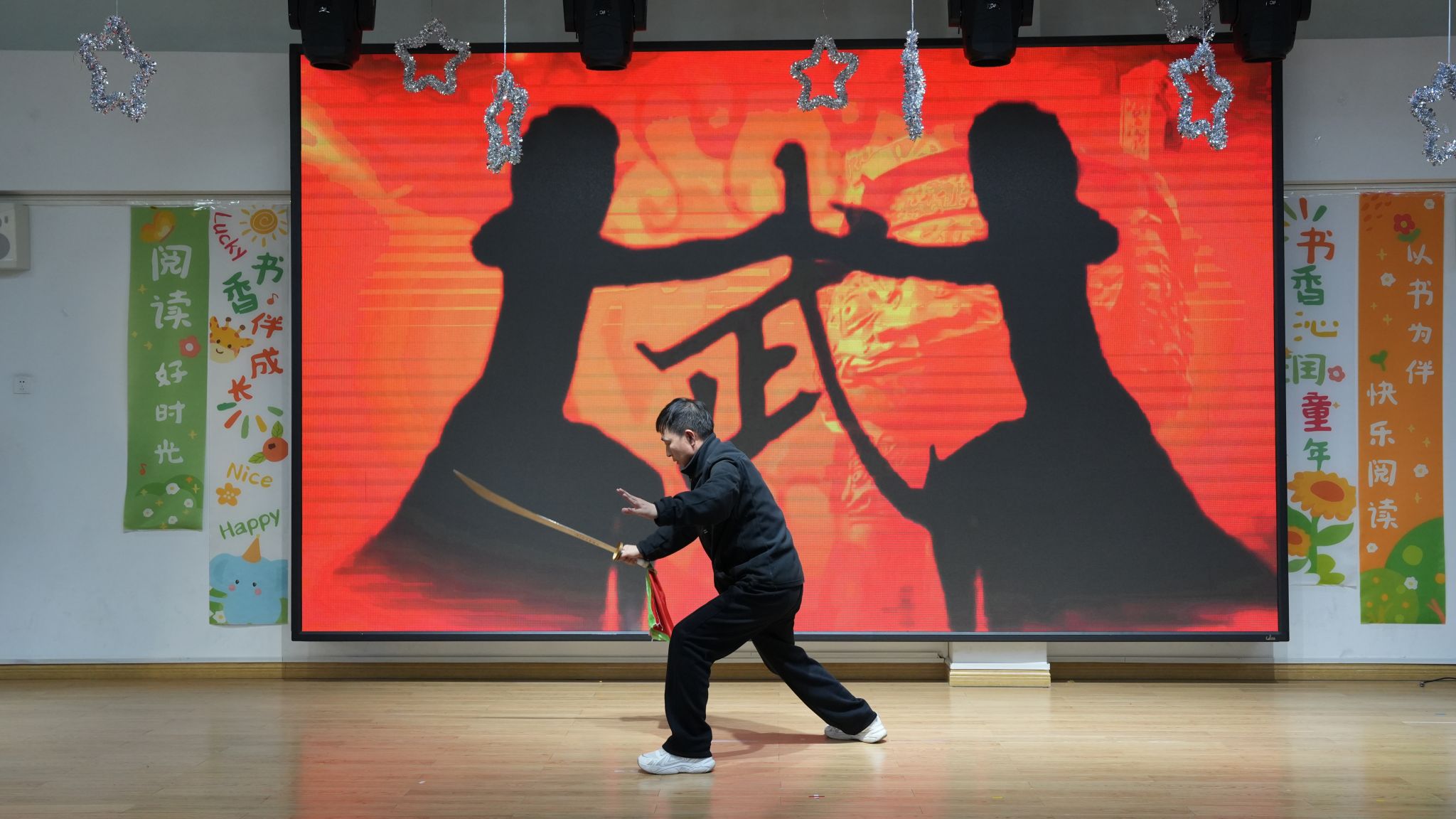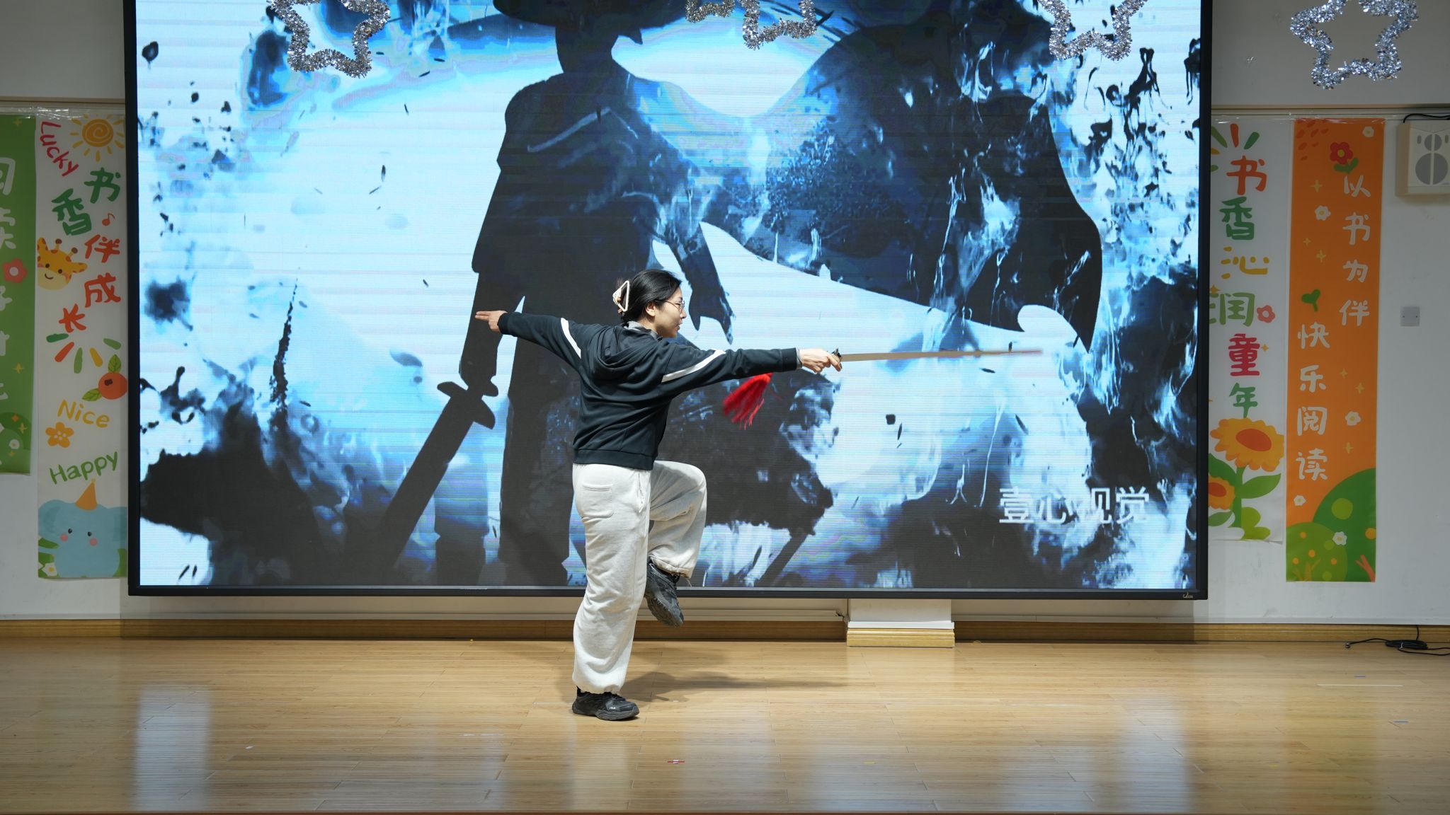 舞蹈表演结束后,太极系列展演正式拉开帷幕。太极刀表演中,刀光流转间尽显刚健威猛,一招一式都充满力量感;太极剑展演则兼具刚柔,剑随身动、身与意合,将太极的飘逸洒脱展现得淋漓尽致;春秋大刀表演气势恢宏,挥舞间风声作响,展现出中华传统武术的博大精深;太极扇表演中,扇子开合有序,与太极动作完美融合,刚柔并济、韵味十足;独特的太极毛笔表演更是将太极与书法艺术相结合,志愿者们在运笔间融入太极招式,笔走龙蛇间尽显文化底蕴,让孩子们领略到传统艺术的多元魅力。整场展演精彩纷呈,赢得了师生们的阵阵掌声。